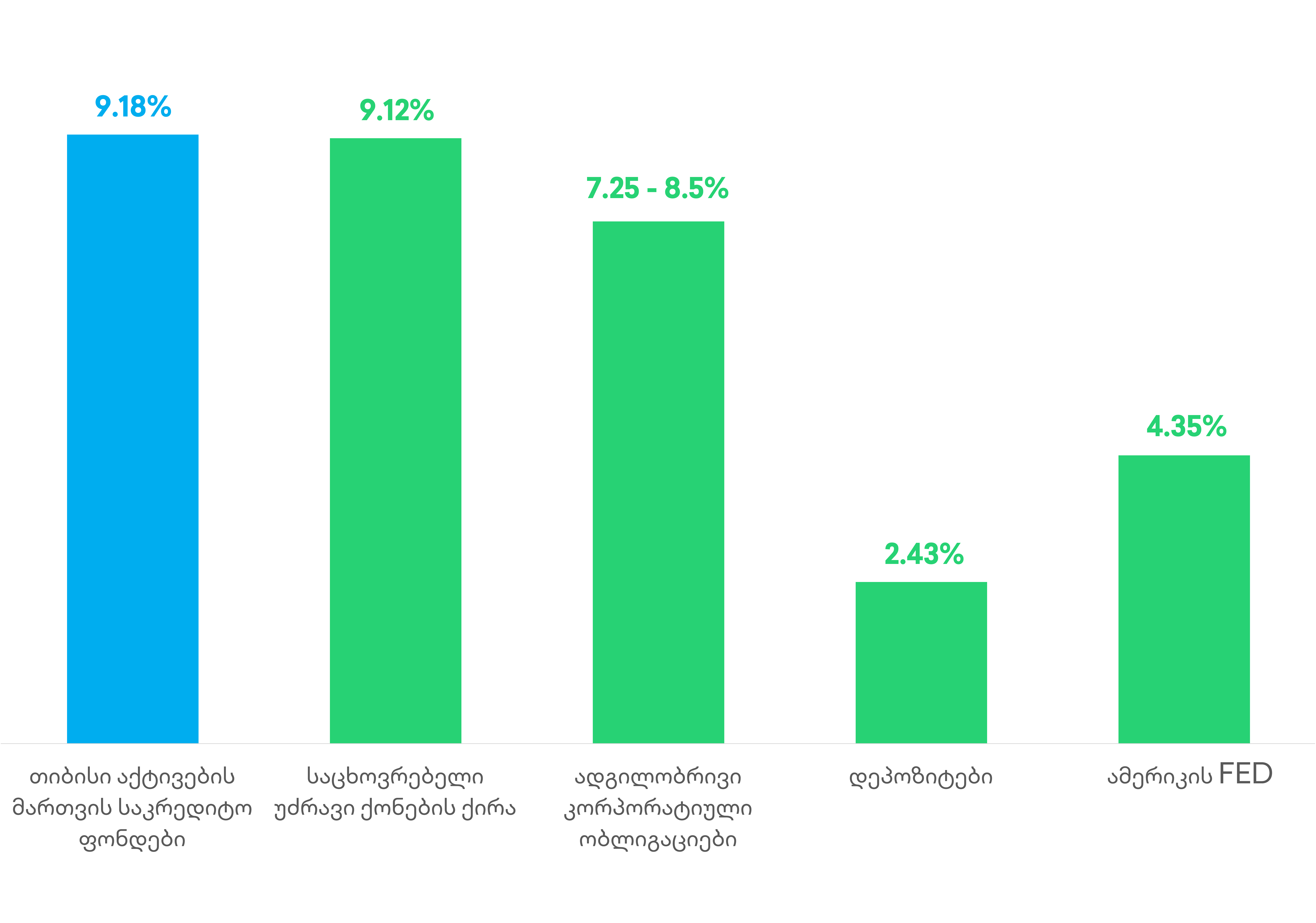 ბოლო 12 თვის შემოსავლიანობა შერჩეულ ინვესტიციებზე. წყარო: საქართველოს ეროვნული ბანკი, თიბისი კაპიტალი, თიბისი აქტივების მართვა, Federal Reserve Bank of St. Louis (FRED). დეტალებისთვის იხ. ბმული