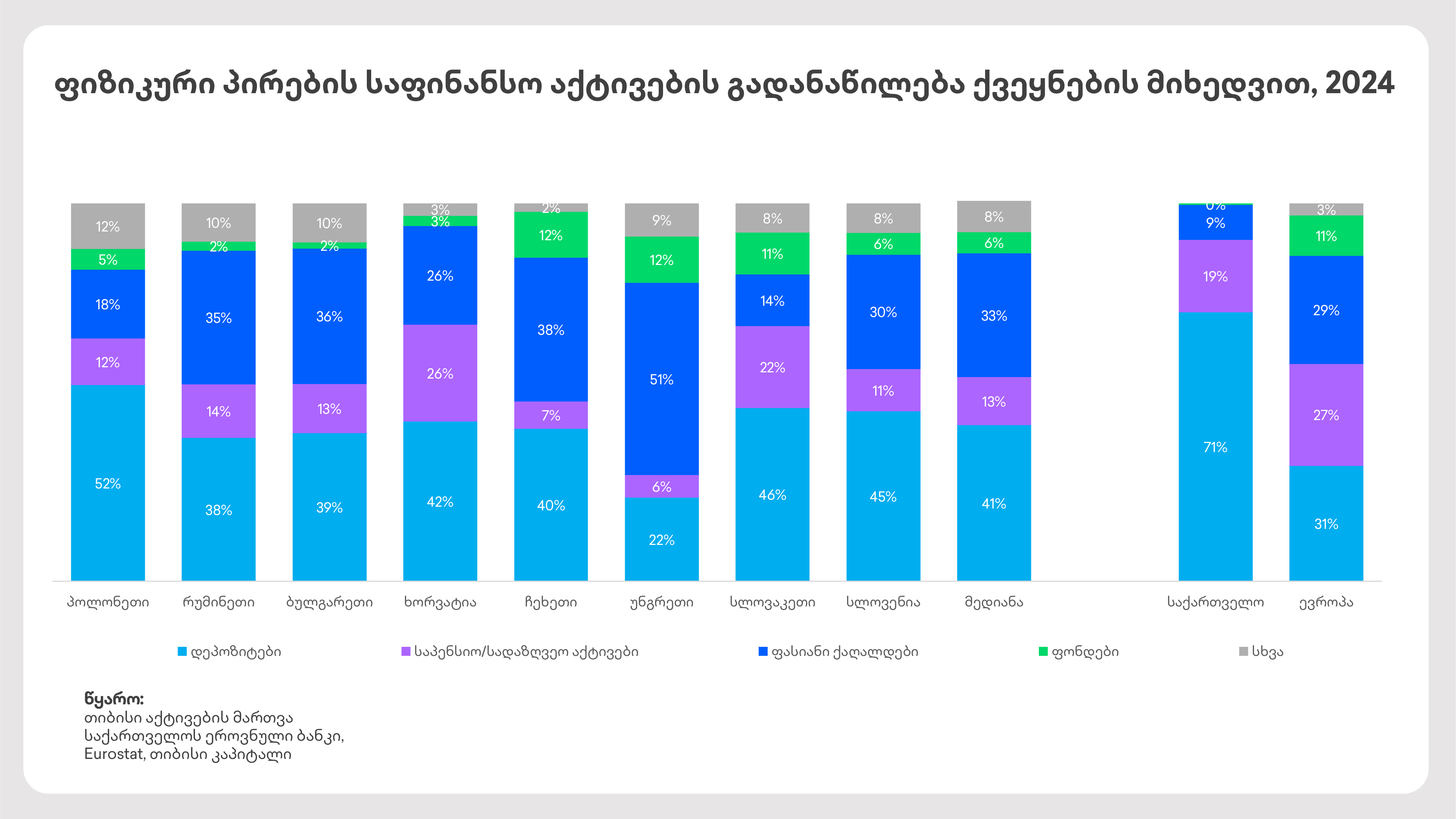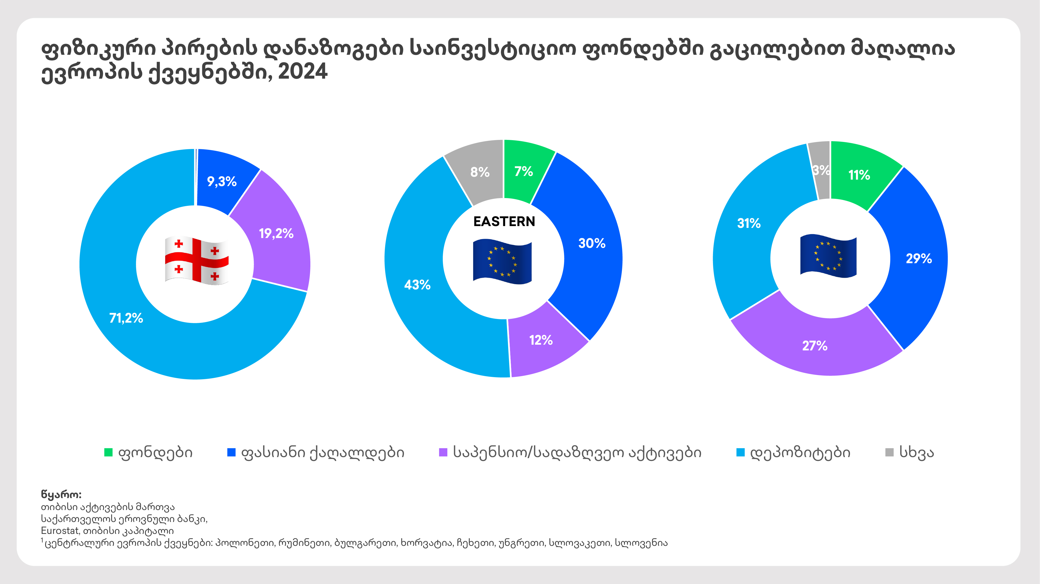 ევროპის განვითარებულ ქვეყნებში სურათი საპირისპიროა: მოქალაქეების დანაზოგების 69% ფონდებში, ფასიან ქაღალდებსა და საპენსიო/სადაზღვევო აქტივებშია განთავსებული.